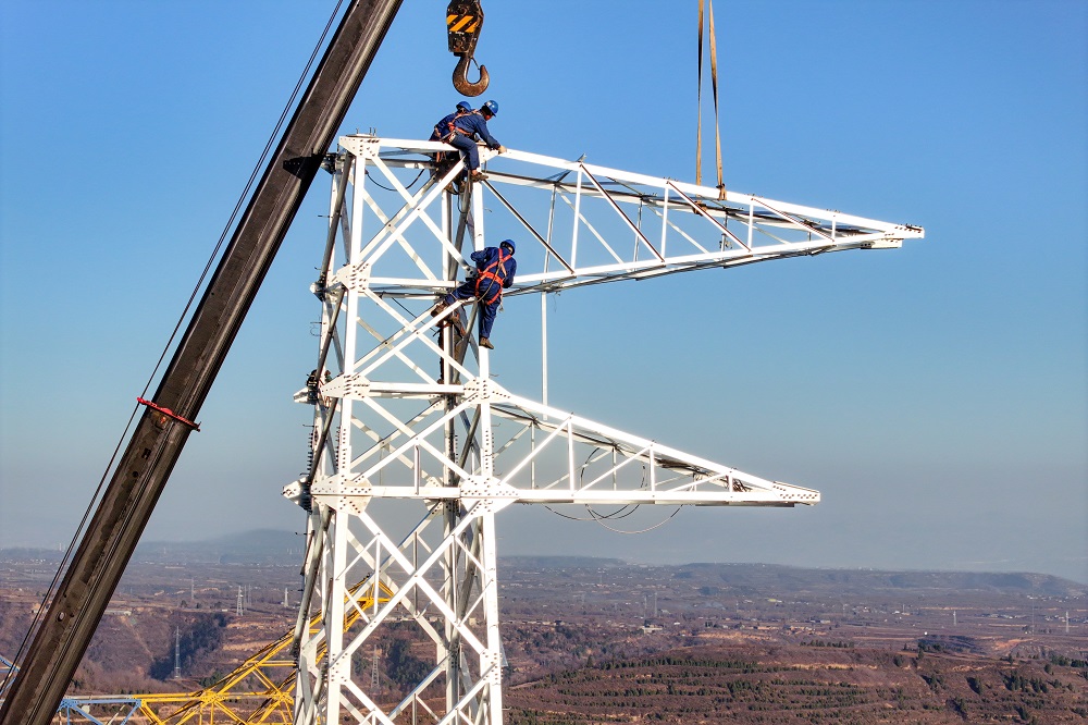 1月1日,国网山西送变电公司施工人员坚守施工现场,在500千伏忻州北-阳泉线路工程开展落地双摇臂抱杆组塔作业。